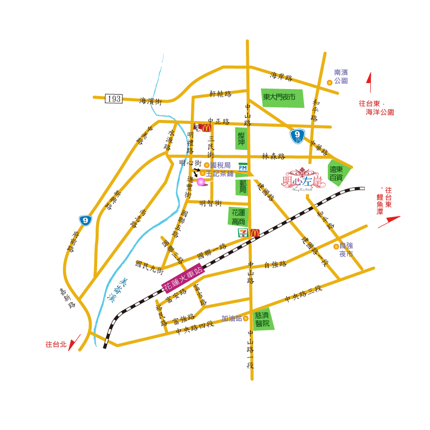 過家樂福地下道 → 右轉新生橋 → 中央路三段 → 慈濟醫院左轉中山路 → 過地下道 → 麥當勞 → 花蓮商校 →國安郵局及全家左轉明心街